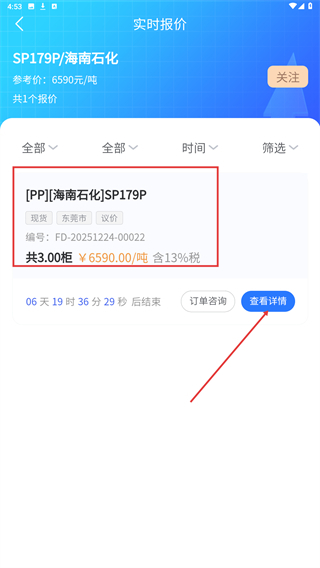 2、在供应列表里找到【SP179P/海南石化】这一条目,点击它就能进入该原料的实时报价详情页面。