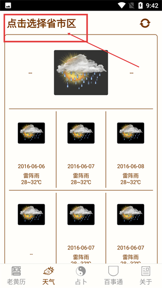1、在【老黄历万年历】主界面,可查看当日黄历信息,点击底部【天气】按钮,即可进入天气功能页面获取气象相关内容。