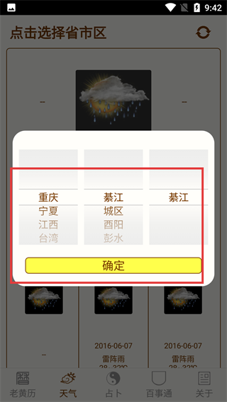 3、在省市区选择弹窗中,选定【重庆】等目标地区选项后,点击下方【确定】按钮,即可加载该地区的精准天气数据。