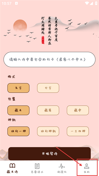 当处于藏头诗功能界面时,点击底部导航栏中的【我的】选项,就能进入对应的个人中心页面。