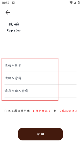 进入注册页面后,需要按顺序填写【请输入账号】【请输入密码】【请再次输入密码】这三个信息,之后点击注册按钮,即可完成注册操作。