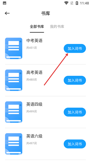 在书库页面找到你想选的词书(比如【中考英语】),然后点击它对应的【加入词书】按钮,这样就完成选择啦。