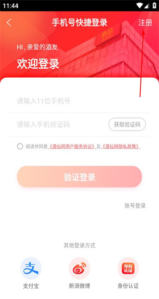 进入手机号快捷登录界面,查看登录所需的各项输入区域,点击注册按钮跳转至账号注册的信息填写界面。
