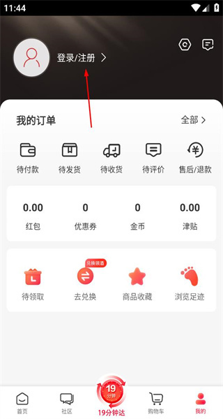 进入个人中心页面后,能看到登录注册选项以及订单相关功能,点击这个选项就可以进入手机号快捷登录页面。