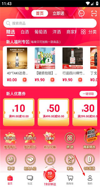 打开软件进入首页后,浏览精选商品并查看新人优惠券,接着点击“我的”选项进入个人中心页面。