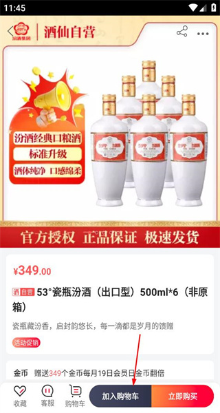 回到软件首页后,找到53度瓷瓶汾酒并点击进入,在商品详情页浏览商品描述,之后找到“加入购物车”的按钮。