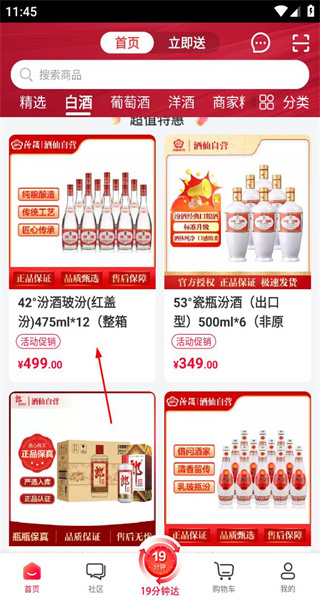 打开软件后,首页设有精选白酒等分类以及多款酒类商品,从中选择42度汾酒玻汾,随后进入该商品的详情页面。