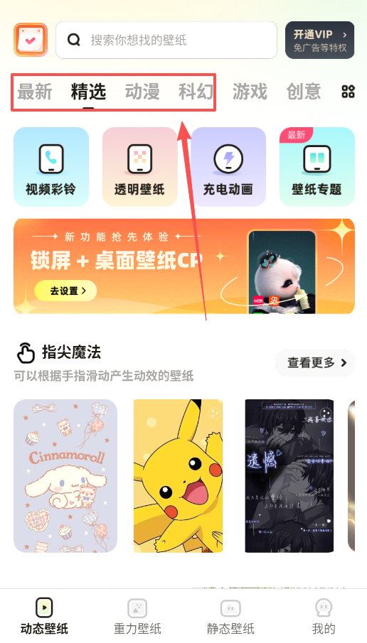 第一步是浏览首页,顶部类似标签页的“精选、动漫、科幻”为内容分类入口,你可以由此开启喜欢风格的探索之旅。