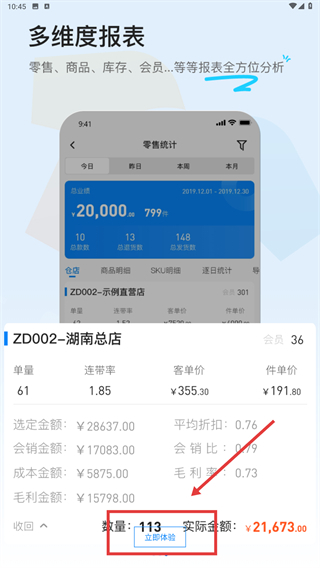 在多维度报表页面点击【立即体验】按钮,就能进入零售统计等报表分析功能模块。