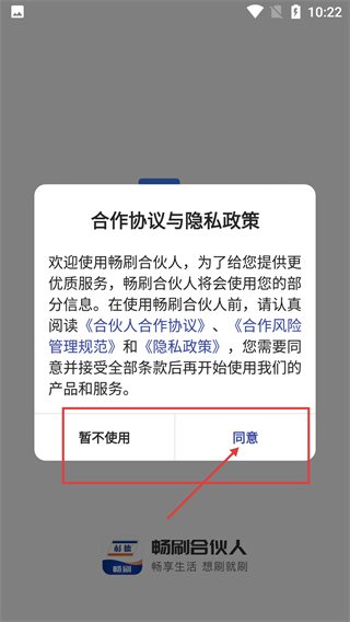 进入后会弹出【合作协议与隐私政策】的弹窗,点击【同意】按钮即可使用【畅刷合伙人】功能。