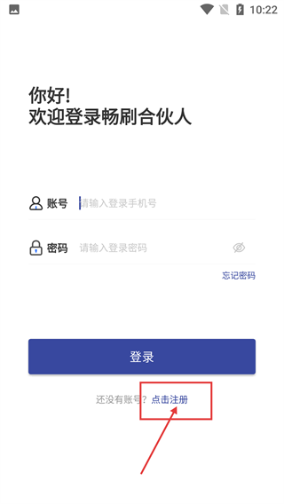 进入【欢迎登录畅刷合伙人】页面时,需要填写【请输入登录手机号】和【请输入登录密码】这两项内容;如果还没有账号,可以点击【点击注册】按钮进行注册。