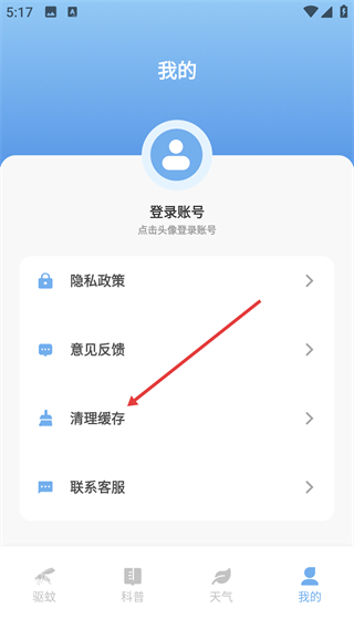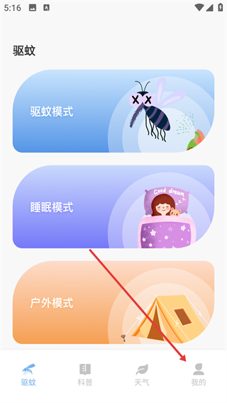 在驱蚊类应用的首页,点击底部导航栏中的【我的】选项,即可进入个人中心页面。