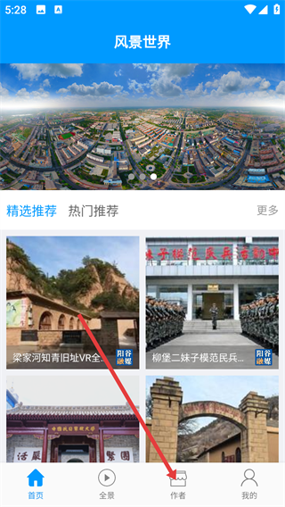 进入【风景世界】的首页后,能够查看【精选推荐】下的【热门推荐】板块内容,接着点击底部导航栏中的【作者】选项,就能进入对应的页面了。