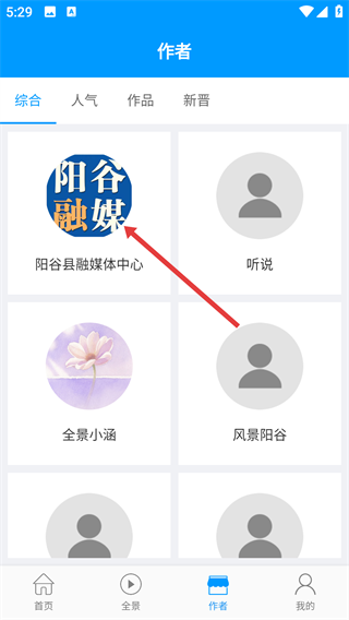 在【作者】页面的【综合】分类中,找到【阳谷融媒】这个作者选项,点击它就能进入该作者的专属主页。