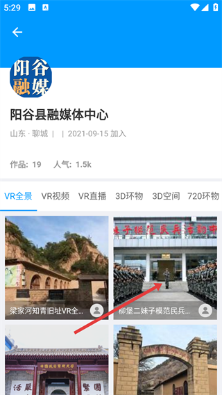 进入【阳谷融媒】主页后,找到并点击【VR全景】分类,接着选择你想查看的目标内容项,就能进入该内容的预览界面了。