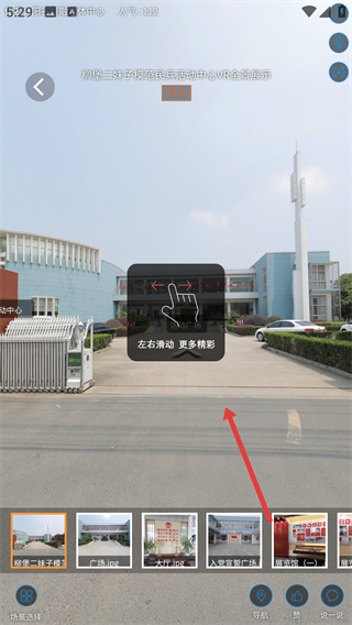 在VR全景内容页面,根据提示【左右滑动-更多精彩】进行操作,就能浏览该场景的不同视角内容。