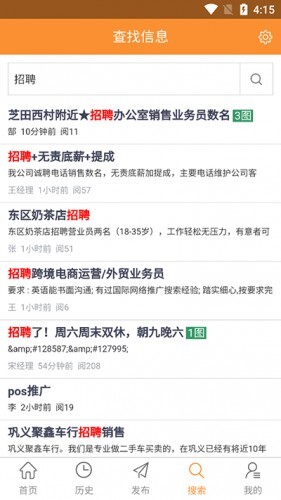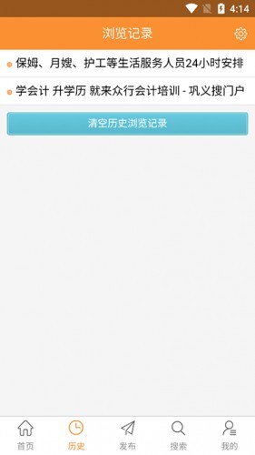 在本站安装巩义搜后,你会发现底部设有首页、历史、发布、搜索和我的这五个板块。