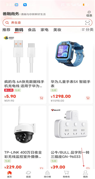 打开软件进入首页后,页面会展示数码类商品及其对应的价格,点击“我的”选项即可进入个人中心页面。