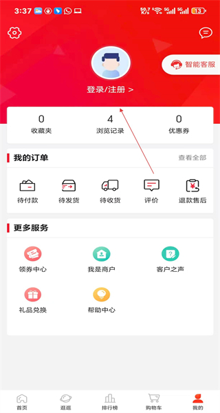 进入个人中心页面后,能看到登录注册选项以及订单服务相关内容,点击这个登录注册选项,就可以进入对应的登录注册页面。
