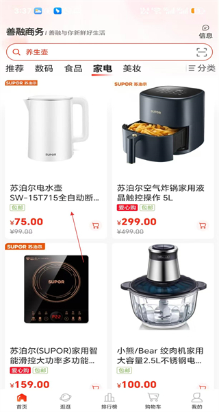 完成登录操作后回到软件首页,页面会呈现苏泊尔等品牌的商品及其对应的价格,用户可以接着开展商品浏览的相关操作。
