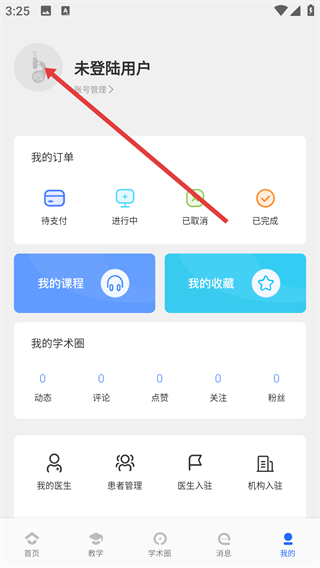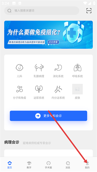 进入应用首页后,能看到科室分类、病理会诊等功能板块,此时点击底部导航栏中的【我的】按钮,即可进入个人中心页面。
