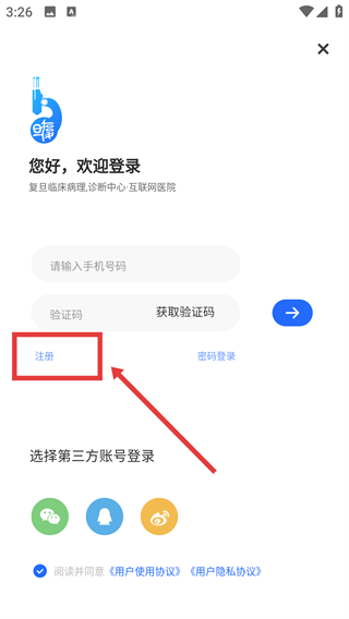 在登录界面,勾选《用户使用协议》和《用户隐私协议》后,点击【注册】按钮,即可进入账号注册页面。