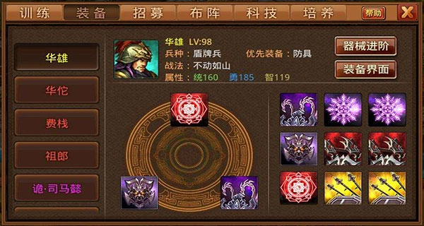 3、兵力问题:阵法若处于空缺状态则无法安排上阵,兵营要是兵力耗尽便不能调出大本营,因此兵力的调控十分关键(兵力一旦损失似乎是100%的)。
