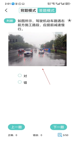 进入判断题页面后,面对的是关于施工路段需减速的题目,完成对错判断后选择相应的选项即可。