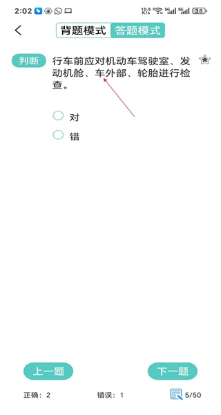 进入下一题的页面,该题目围绕行车前的车辆检查展开,选择正确或错误的选项后,点击下一题按钮继续完成答题流程。