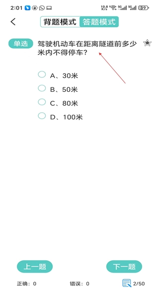 进入单选题界面,题目是关于隧道前停车距离的,浏览选项后挑选出正确答案。