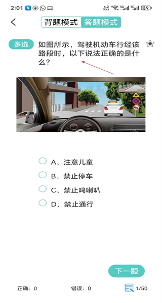 打开软件后,进入答题模式,第一道题是多选题,内容围绕路段展开,查看选项后选择对应的答案。