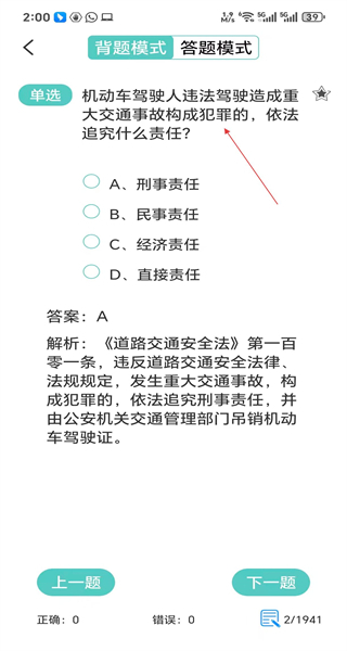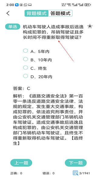 进入练题界面后,会看到单选题及其对应的选项,接着可以查看答案和解析内容,之后点击下一题就能继续进行练习。