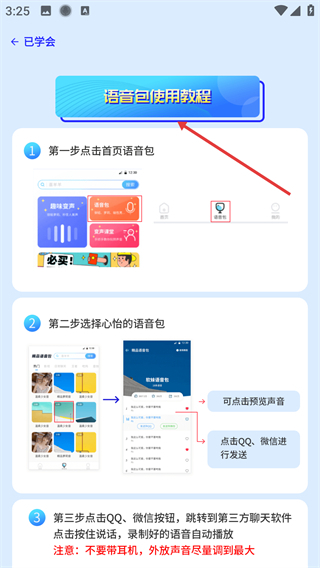 在使用教程页面,点击【语音包使用教程】选项,即可查看语音包功能的详细操作指引。