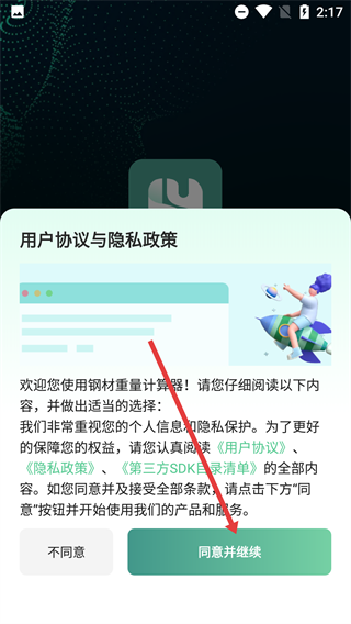 在确认同意所有条款后,点击弹窗里的【同意并继续】按钮,就能进入应用主界面,使用钢材重量计算的相关功能了。