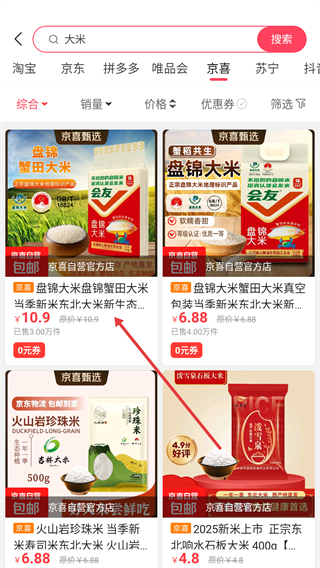 在京喜平台的商品列表里,能够查看盘锦大米这类商品的价格、销量等信息,进而挑选出想要的商品。