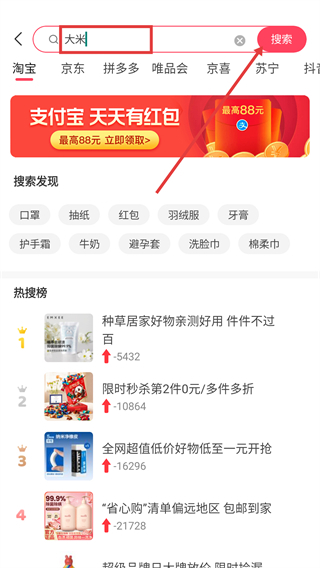 在搜索框里输入“大米”,再点击【搜索】按钮,就能触发多个平台的商品搜索功能。