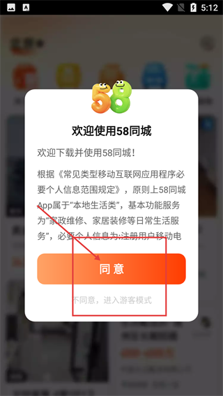 使用【58同城】时,需先了解其属于【本地生活类】的信息规定,点击【同意】即可进入,也可以选择【不同意-进入游客模式】。
