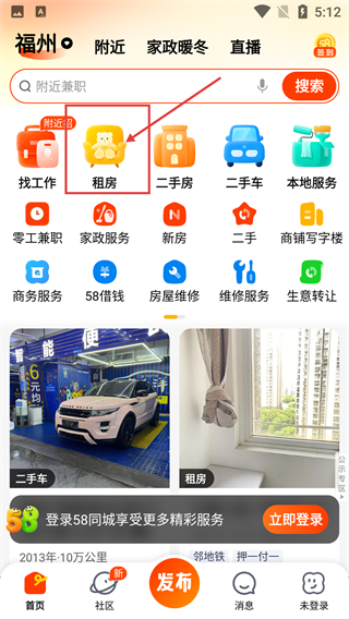 进入首页后,找到【租房】功能入口,它是首页核心服务选项之一,点击即可进入租房相关页面。