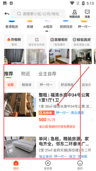 进入租房页面后,能看到像【整租|福清水南中34号公寓-1室1厅1卫】这样的推荐房源,浏览租金等相关信息后,点击即可进入详情页面。