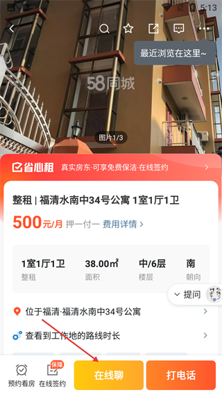 进入房源详情页面后,可点击【在线聊】按钮咨询房源相关情况,同时也能查看房源的面积、楼层等具体信息。