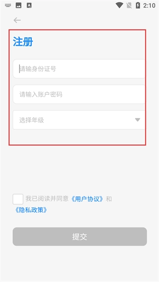 进入注册页面后,需要填写【请输入身份证号】和【请输入账户密码】这两项内容,同时还要选择【选择年级】,以此来完善注册信息。