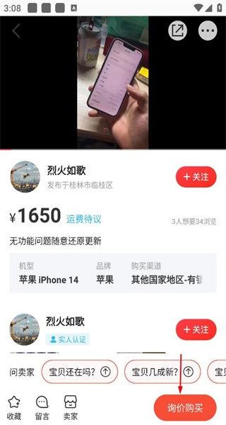 挑选苹果iPhone14商品进入详情页面,浏览相关信息后,点击询价购买按钮,发起该商品的购买咨询。
