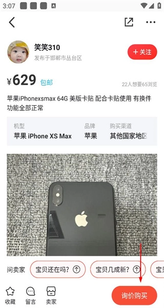 在苹果iPhone XS Max的详情页面,浏览完价格、功能等相关信息后,点击页面底部的“询价购买”按钮,即可发起购买咨询。