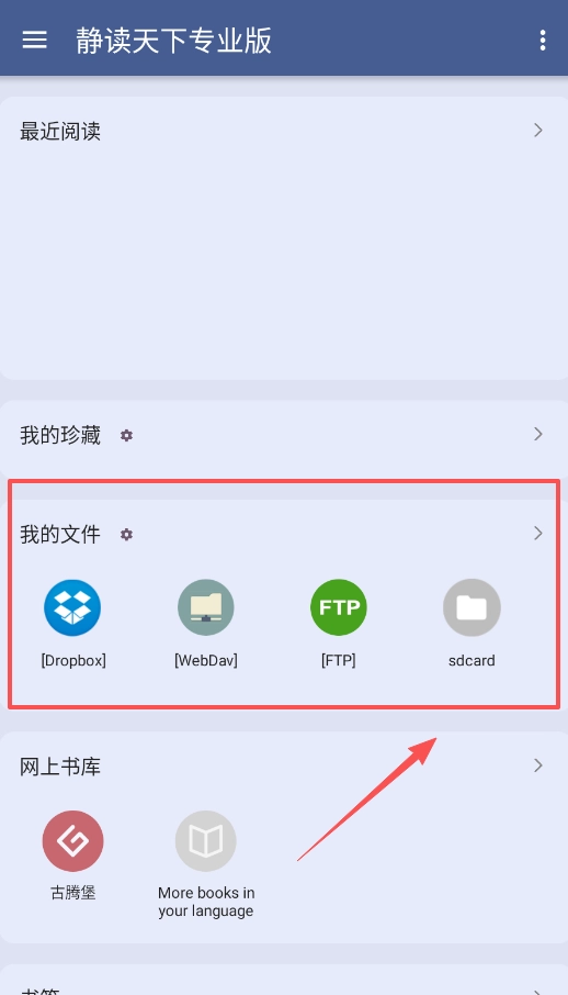 软件主页整合了本地与云端资源,你不仅能浏览手机里的书,还可以通过网上书店发现像古腾堡这类免费外文书籍。