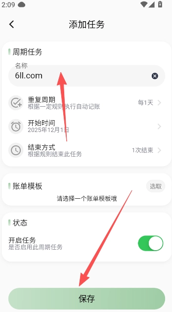 在添加记账的任务页面里,输入各项信息并设置好条件后进行保存。