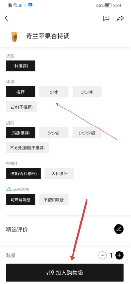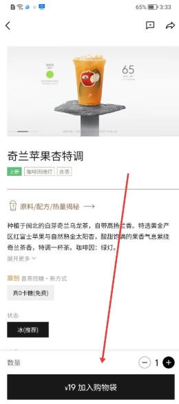在点单界面挑选当季推出的奇兰苹果杏特调,了解这款茶饮的用料与定价后,进入规格选择界面。