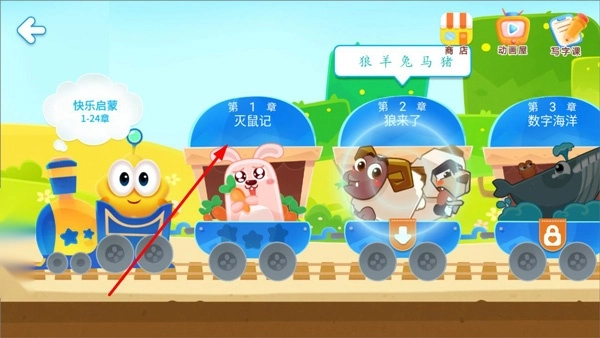 打开星娃娃识字后进入主页,主页按章节划分为快乐启蒙(1-24章)、全面提升(25-55章)和轻松运用(56-90章)三个板块,此外还有游乐园玩法。建议用户根据自身需求从启蒙阶段开始使用。