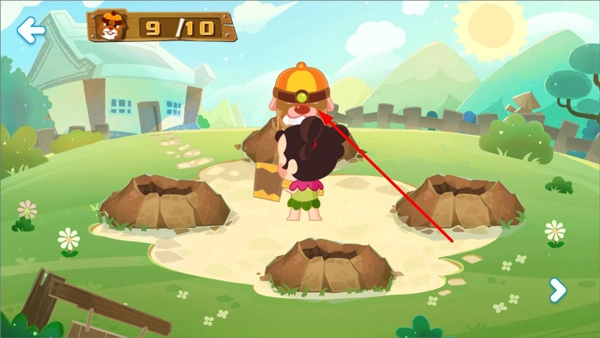 第一章的识字目标包含前、后、左、右四个方向词,用户需按照提示操控场景中的人物进行打地鼠游戏,以此完成相关内容的学习。