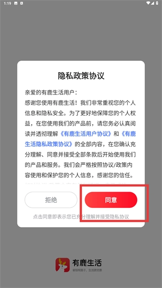 在隐私政策协议弹窗中,点击【同意】功能按钮,确认接受协议后即可继续使用。