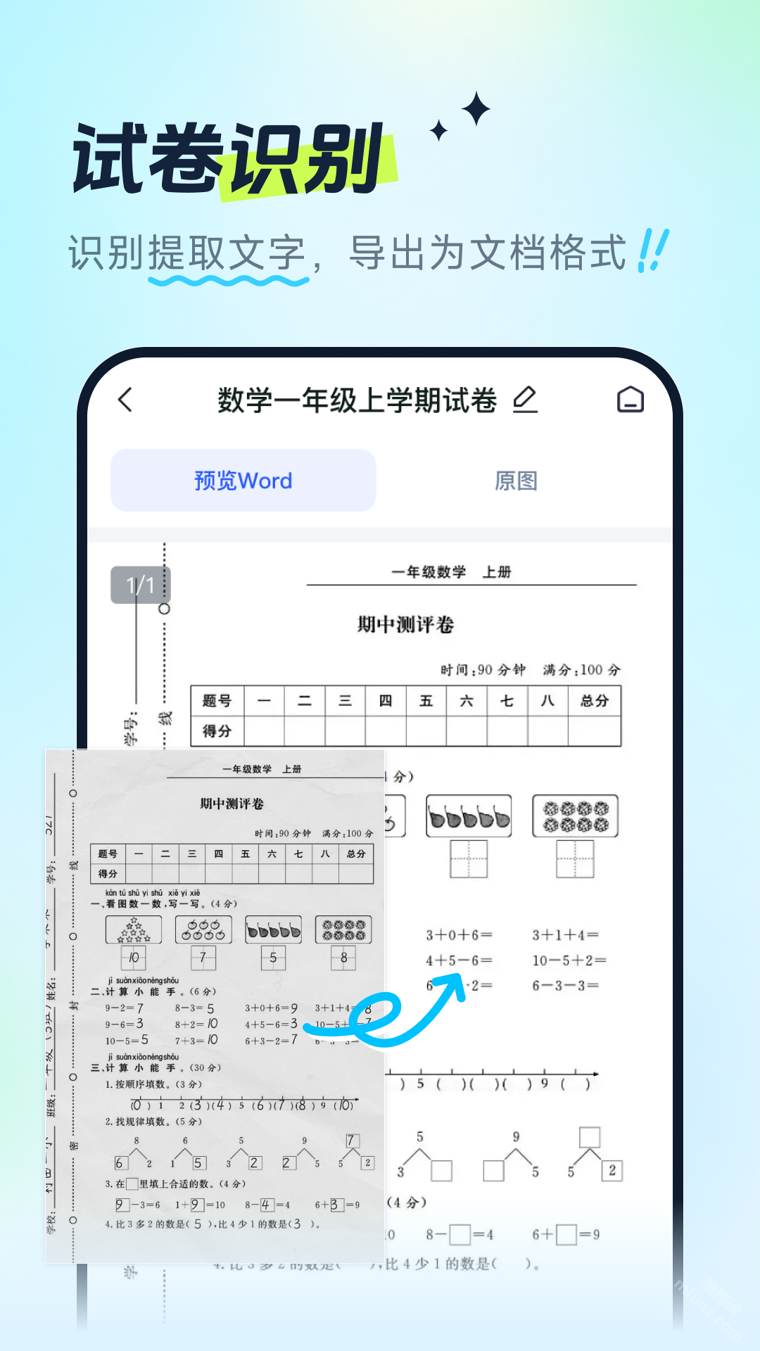 可以轻松将试卷转换成可编辑的Word或PDF格式,识别后的文字还能进行自定义编辑。